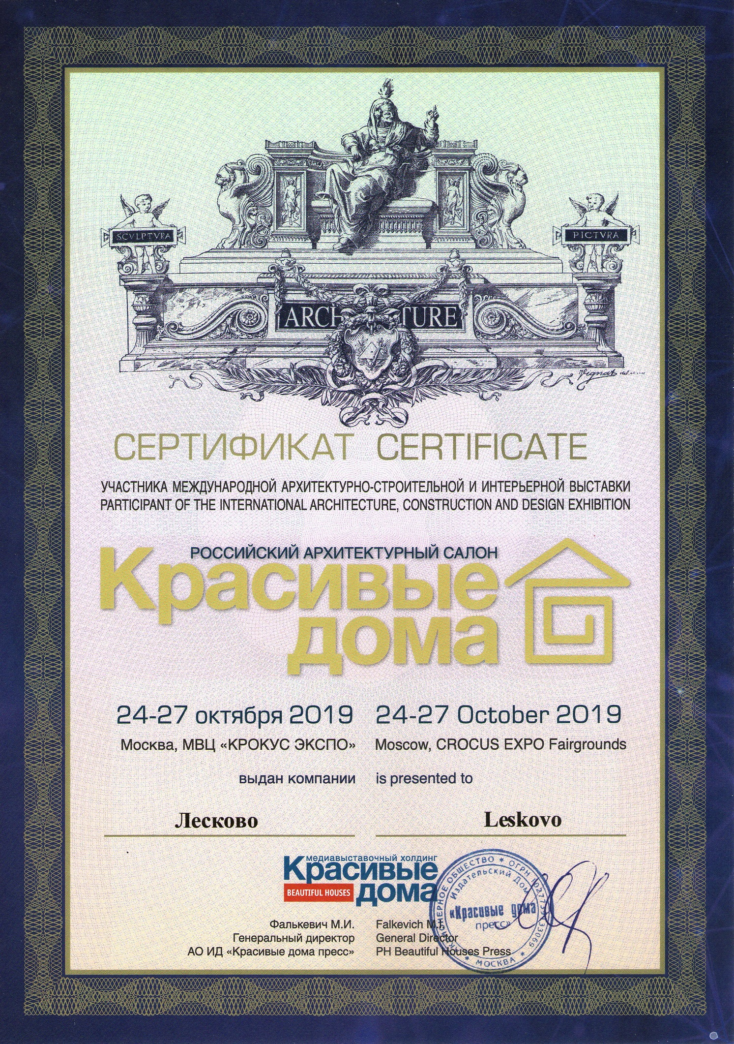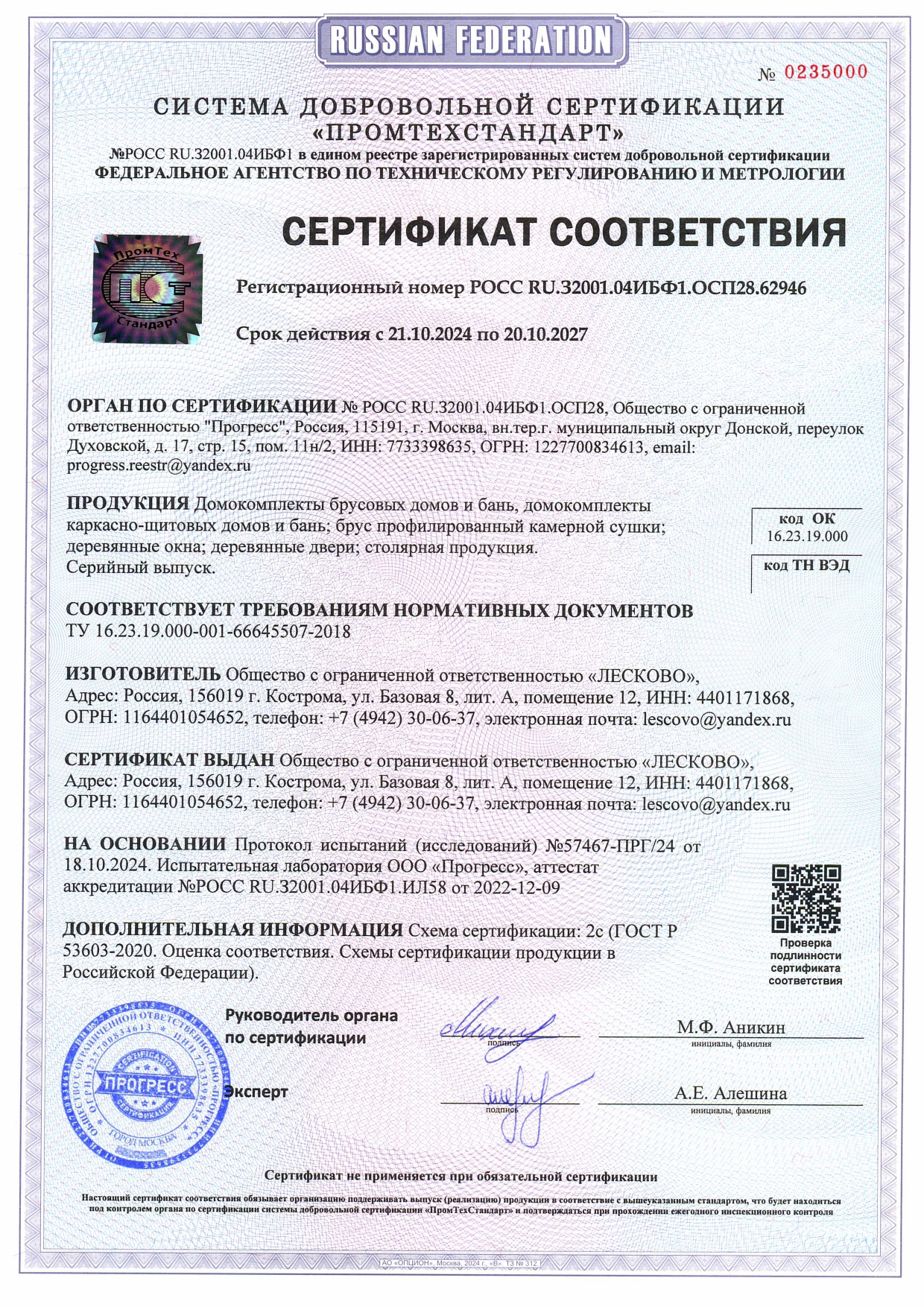 Ежемесячный объем выпускаемой продукции около 500 м³. Для изготовления стенового комплекта мы используем хвойные породы дерева из Костромской области — ель, сосну. Вся выпускаемая продукция сертифицирована.